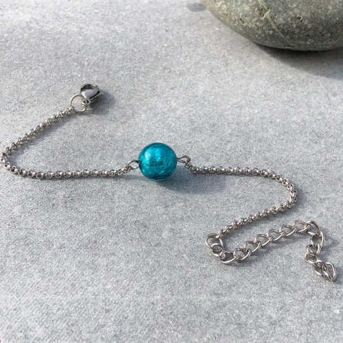 Il se compose d'une perle ronde de couleur bleu canard (très joli bleu turquoise tirant légèrement sur le vert) en verre façon murano avec inclusion d'une feuille d'argent, de 10 mm de Ø