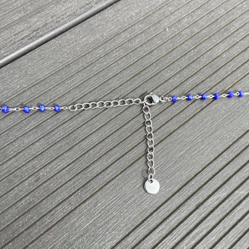 Il se compose d'une chaîne en plaqué argent 5 microns soit de bonne qualité, agrémentée de petites perles en verre bleues, couleur lapis lazuli, facettées de 3 mm de Ø.